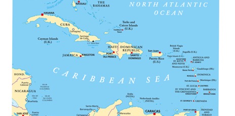 The illustration shows a map of the Caribbean with its island archipelago.