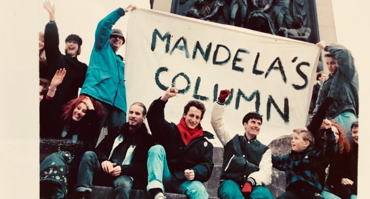 With the paralysis over and our work completed, the three of us were helped up on to the column’s plinth to display our banner (see illustration) and soon we were surrounded by others and the cheering began. Soon there was silence as the now large crowd waited apprehensively for Big Ben to strike two. It did, but apart from muted clapping the Square remained eerily quiet; the problem was that the portable radios in the audience that were reporting events from outside the Victor Verster Prison near Cape Town, endlessly repeated how Mandela had not yet appeared.