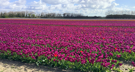 The first illustration shows a photo taken four weeks ago of a field of purple tulips near la Torche. In the far distance can be seen single rows of tulips that are yellow and blue.
