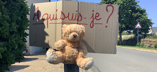 The first illustration is a photo taken four months ago announcing the loss of a Teddy Bear. The poster was pinned to a tree near our home in Richmond. The second photo, which was taken last week, shows a poster of a Teddy Bear found in Tréguennec; the message reads: ‘To whom do I belong?’
