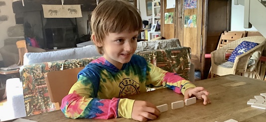 Back to his discovery. Six weeks ago, River and his father came to stay with us in Brittany. On a table, Rohan had put a set of adult dominos with dots, rather than pictures, on the face of each tile. Initially, River took no notice, but with Rohan’s gentle prompting he became interested and soon learned to recognise the number of dots on each tile end without needing to count, and also to realise how, in the game, like numbers had to be matched.