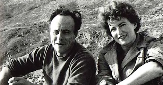 The illustration show a photo of Delia and Patrick Heron on a beach in Cornwall in July 1959.