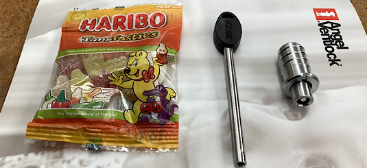 The illustration is a photo of a replacement security device for the sash window plus its key – with the manufacturer’s name just visible – together with Sue’s gift of a packet of jelly babies. In the background is a leaflet with instructions.